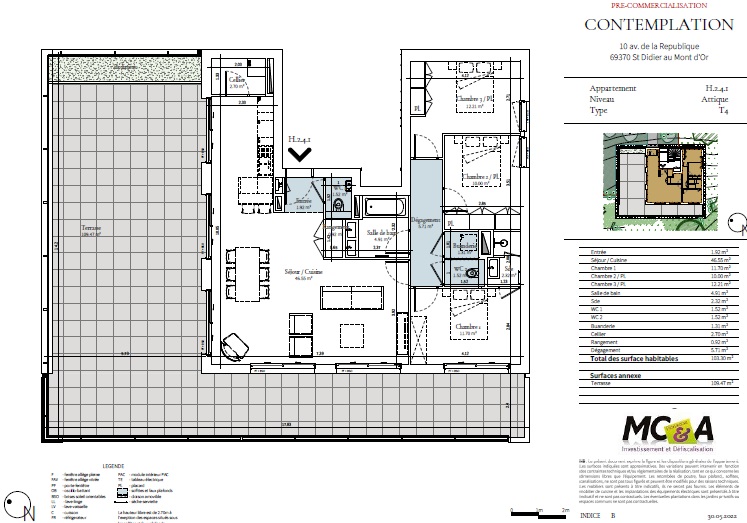 Annonce parue le : 09-10-2023Exceptionnel ! MC&A Patrimoine vous propose ce superbe appartement sur la commune très prisée de Saint Didier au Mont d'Or, à proximité du centre-ville, de la Mairie et des commerces. Sur un terrain en retrait de la route avec une vue dégagée sur les monts du Lyonnais et sans vis-à-vis. Laissez-vous charmer par ce bien d'exception au 2 étage. Ce 4 pièces d'une surface de 104m² est composé d'une cuisine ouverte sur un spacieux salon/séjour . 3 chambres dont une avec salle d'eau privative , nombreux rangements possibles, cellier, buanderie. Salle de bains avec WC séparés. Une terrasse de 110m² avec vue à couper le souffle dans cadre exceptionnel. Proche de Lyon, Dardilly, Limonest, St Cyr au Mont d'or. Idéal résidence principale ou investissement locatif. Pour tout renseignement contacter Arthur DA SILVA